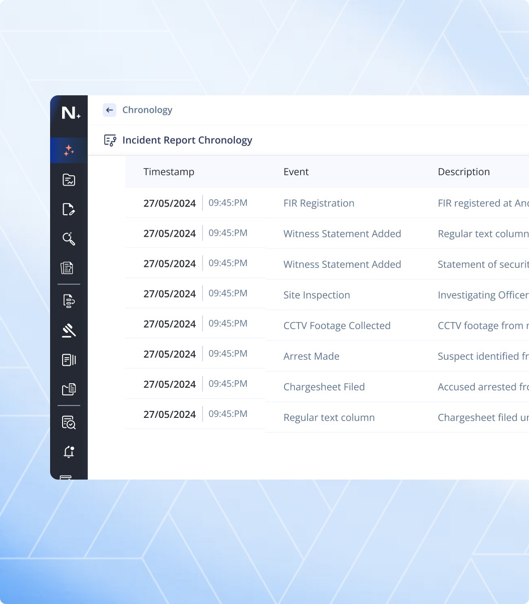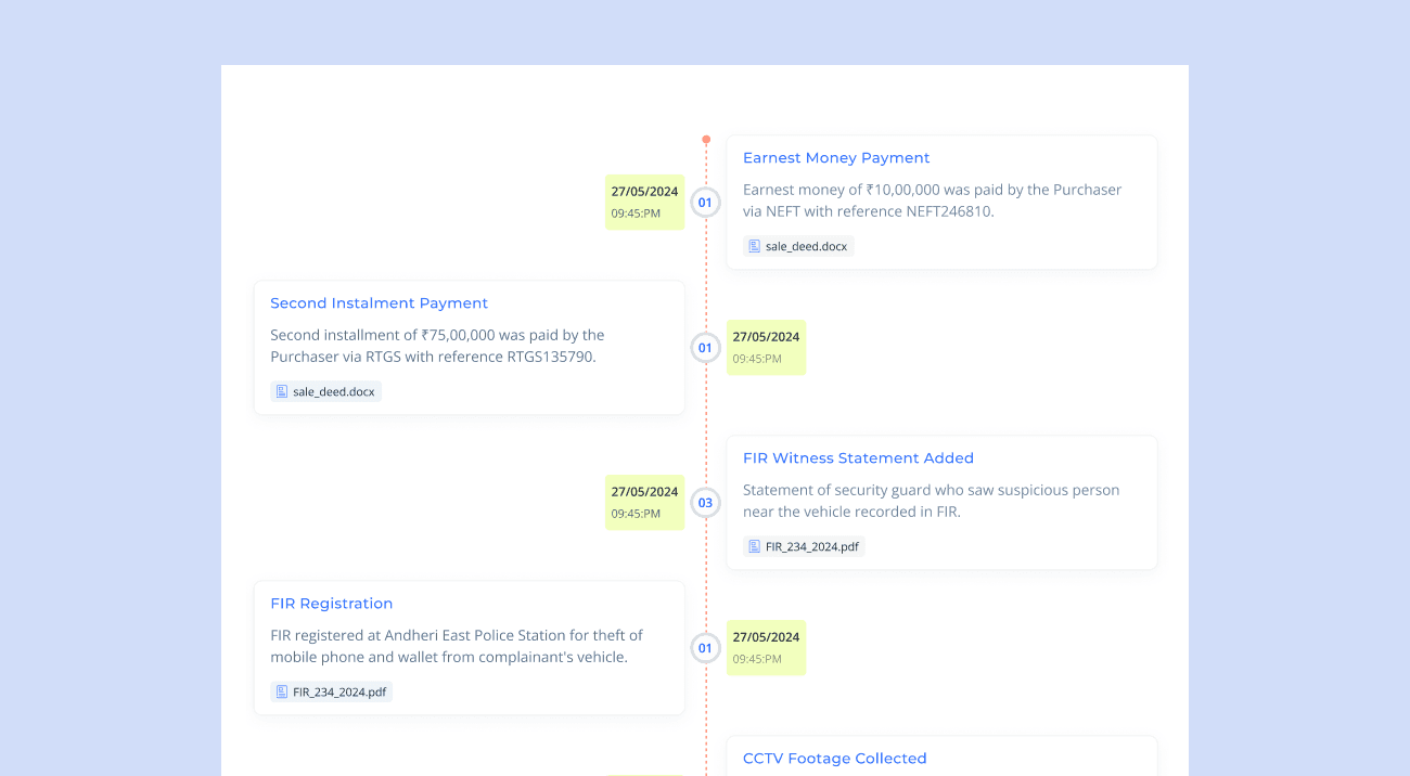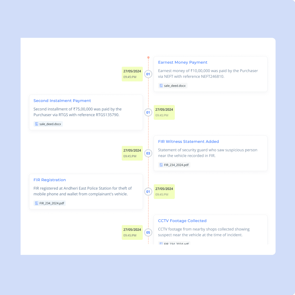 Capture key actions, link events to documents, and gain a clear, traceable view for reviews, audits, and case preparation.