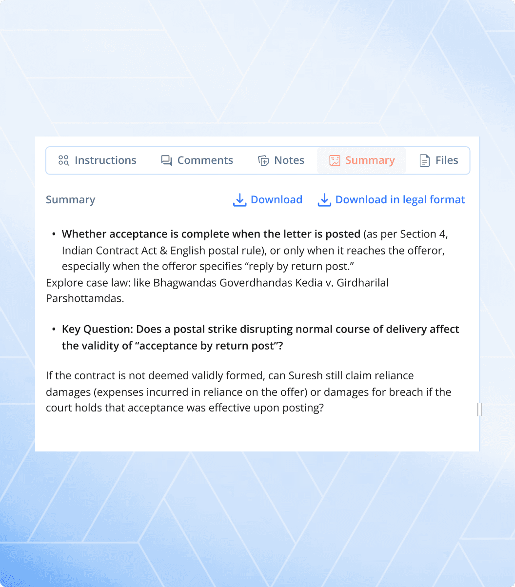 Turn complex legal documents into clear summaries highlighting key issues, duties, and risks.